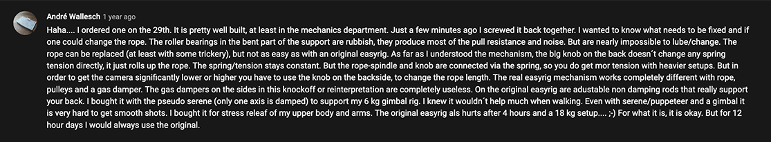 They purchased a unit called “Easyrig 8-18 kg”, made in China to test and see how the product operates, this was their conclusion: